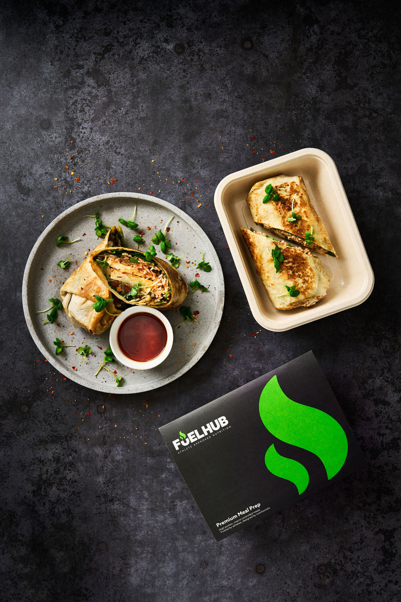 White tortilla loaded with diced chicken breast, cajun rice & beans, roasted veg and sweet chilli sauce