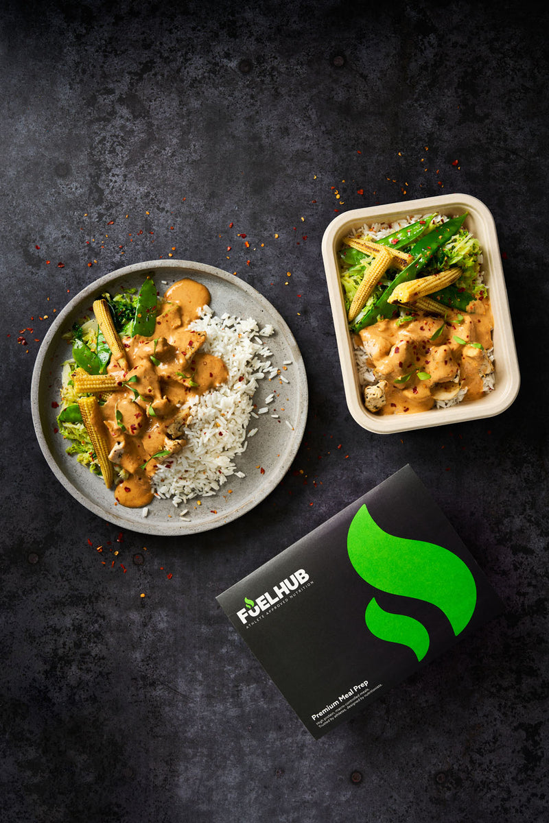 Diced chicken Breast cooked in an aromatic Thai curry sauce, with jasmine rice, savoy cabbage, mangetout and baby corn