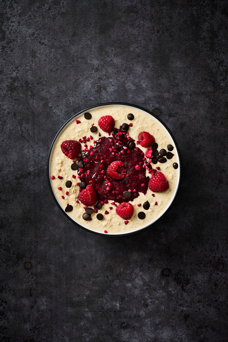 Vanilla protein overnight oats topped with chia raspberry jam, raspberry crumble and dark chocolate