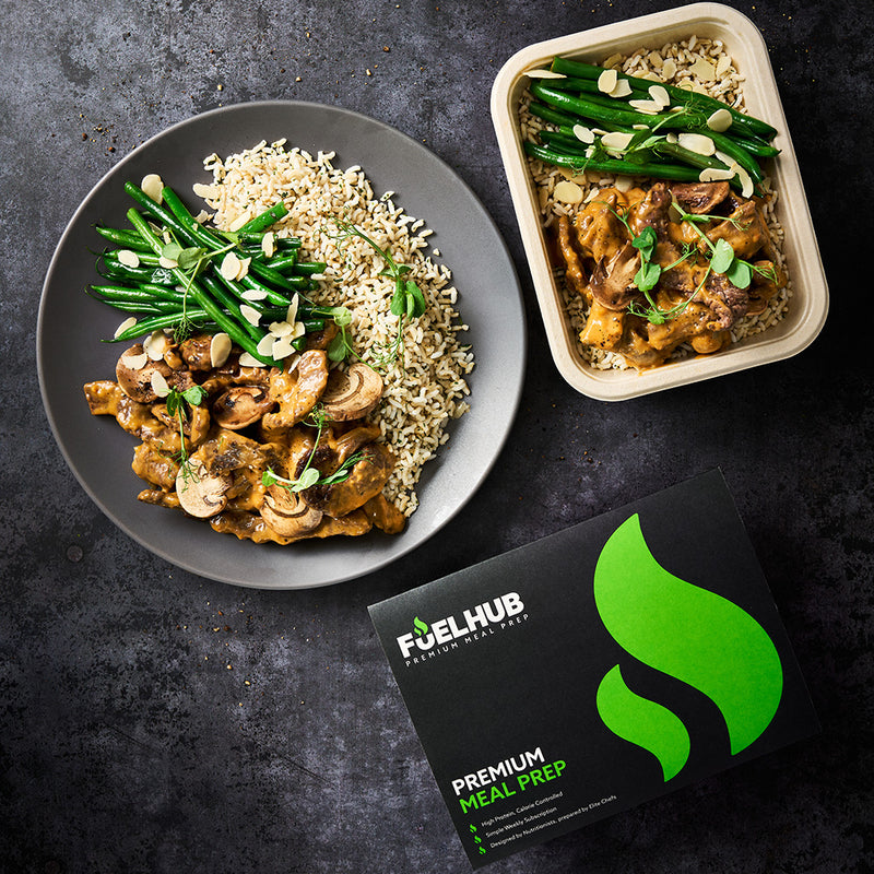 Steak strips coated in mushroom stroganoff sauce, served with wholegrain rice and green bean almondine