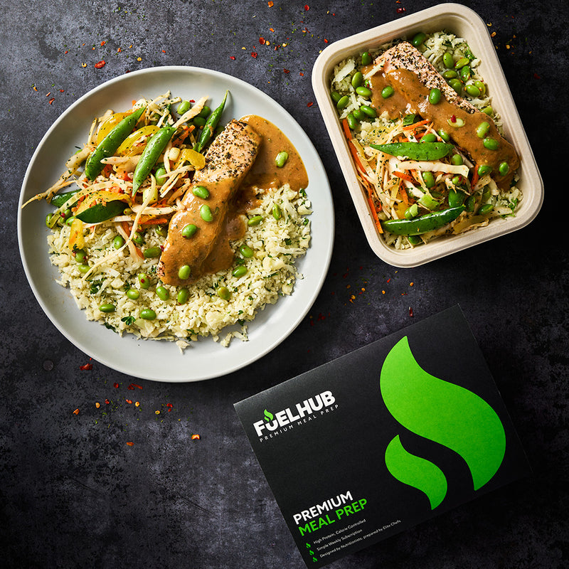 Salmon fillet coated in a citrus miso dressing, served on a bed of cabbage wholegrain rice and crunchy stir fry veg.