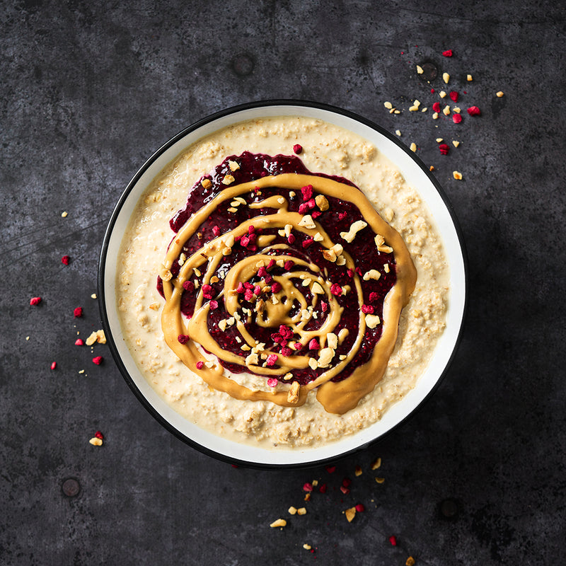Vanilla protein overnight oats with strawberry chia jam and peanut butter.