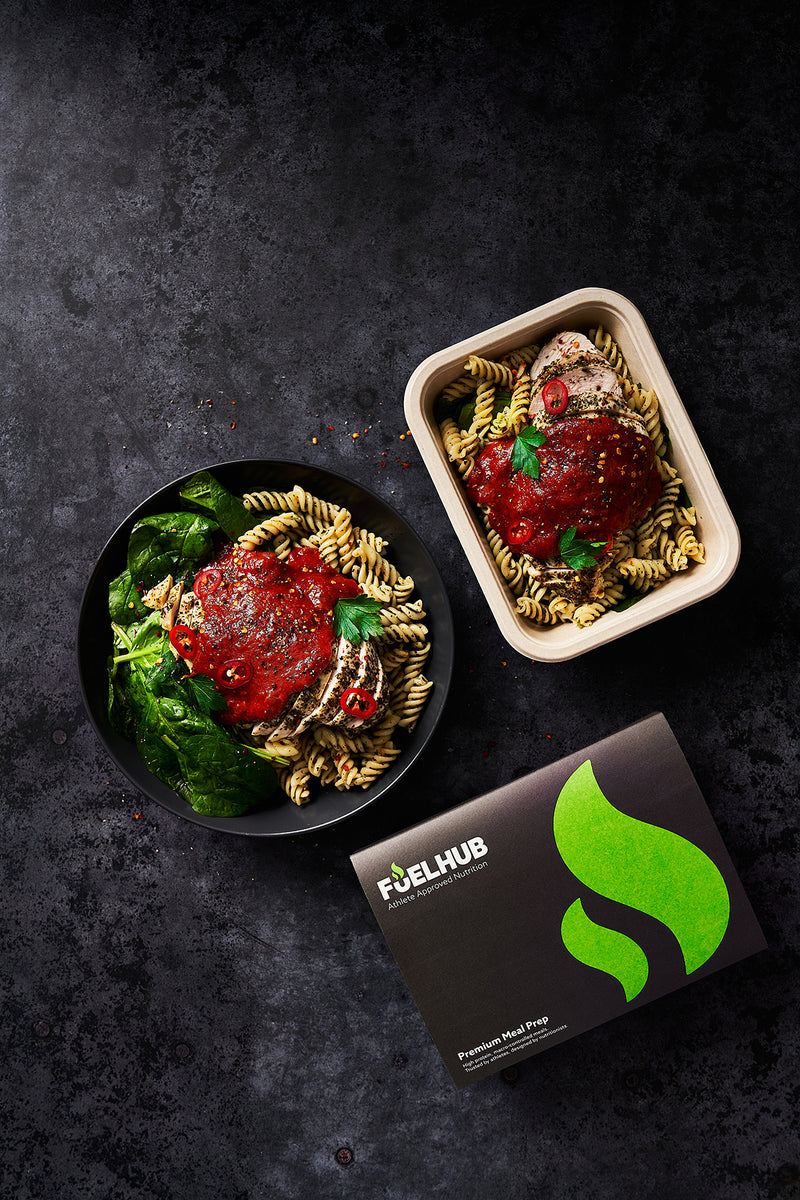 Chicken Breast in a spicy tomato sauce, served with Pasta & Spinach