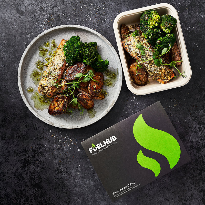 New Potatoes, Salmon (Fish), Broccoli, Basil Pesto (Basil, Olive Oil, Hard Cheese (Milk), Sea Salt), Breadcrumbs (Wheat), Olive Oil, Garlic, Sea Salt, Black Pepper, Dried Mixed Herbs, Onion Powder, Parsley
