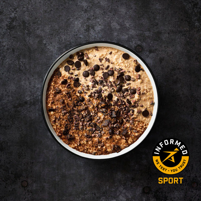 Chocolate protein overnight oats topped with dark chocolate and organic cocoa nibs. Made with informed sport whey protein.